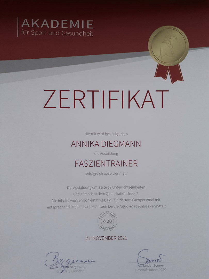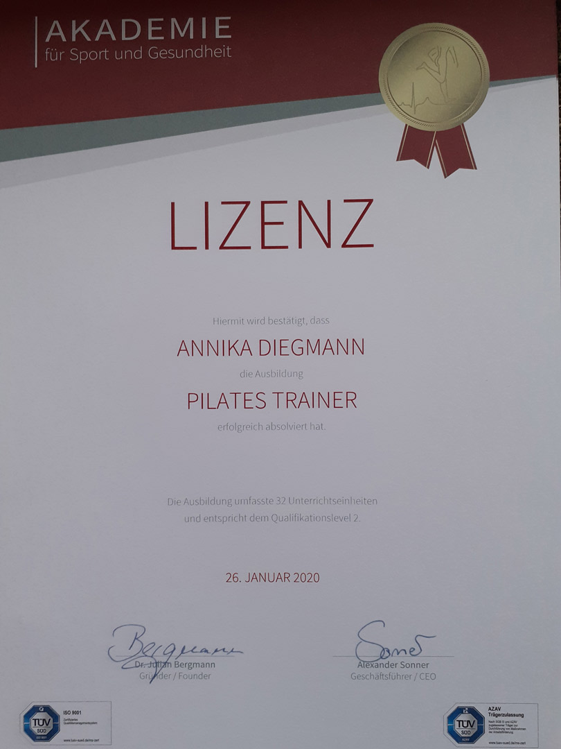 Hallo, mein Name ist Annika Diegmann, ich bin 1975 geboren, praktiziere seit vielen Jahren klassisches Matten- Pilates und bin lizenzierte Pilatestrainerin und Faszientrainerin.